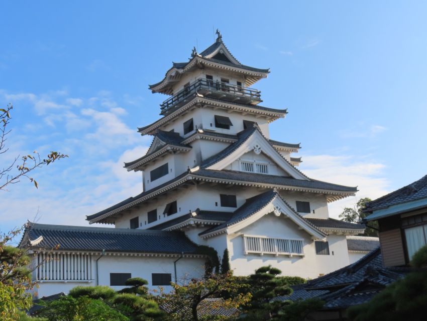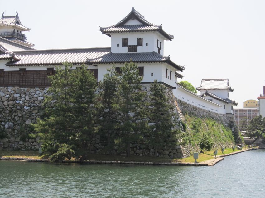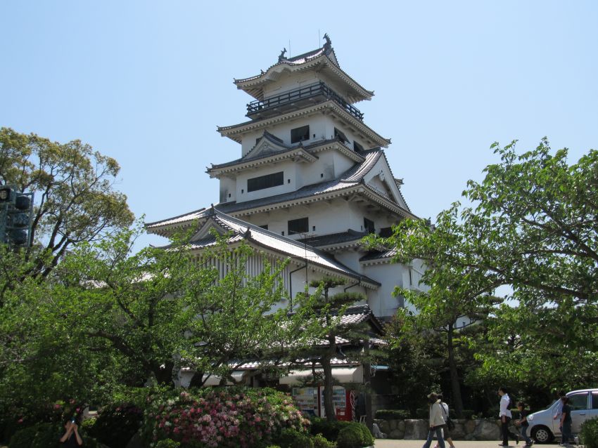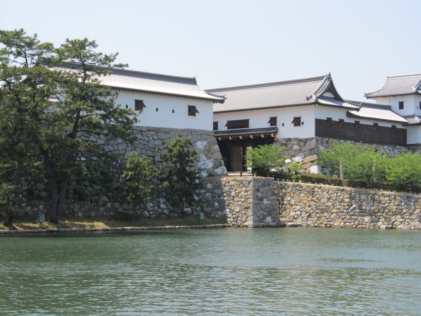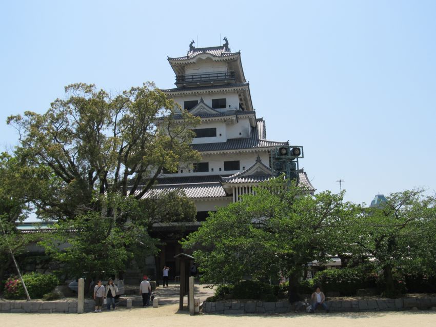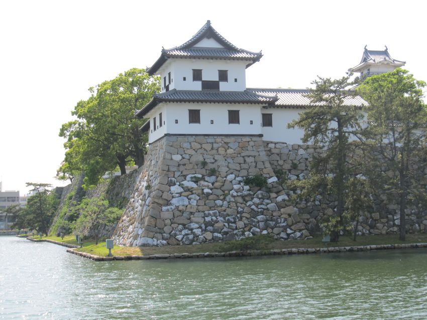 | 今治城は築城の名手・藤堂高虎が瀬戸内海に面した海岸線に築いた大規模な平城で、海水を引き入れた三重の堀や港(船入)などを備えた日本屈指の海城だった。他の城より格段に広い堀には海水を引き入れ、潮の干満によって海水の入れ替えが行われるようになっていた。 高虎は今治城を大規模な海城として築いた以外にも当時としては画期的な枡形の多用や層塔型天守の採用など行い、その後の城郭普請に大きな影響を与えた。 明治維新後に建造物のほとんどが取り壊されたため、内堀と本丸、二の丸、石垣などを残すのみとなったが、近年天守の他、櫓4基が復興されている。堀の外から天守を含め櫓、石垣を見ると海城らしいなかなか美しい姿を見せてくれるお城である。また今治城は、高松城と中津城とともに日本三大水城の1つにも数えられている。 |