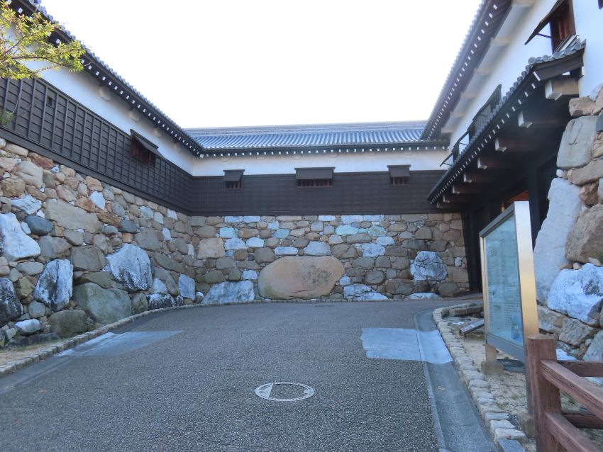 ![]() 石垣と犬走り 石垣は花崗岩や石灰岩などの自然石を積み上げた野面積である。 そして石垣の周りに犬走りをめぐらせている。 犬走りは海近くの脆弱な地盤を補強するためと考えられる。 |