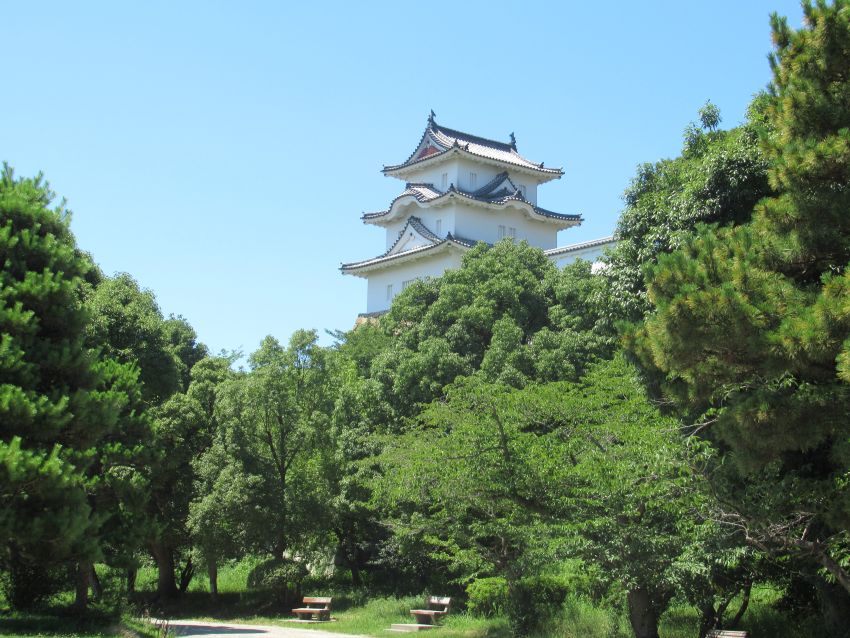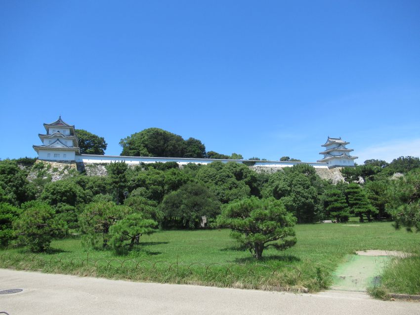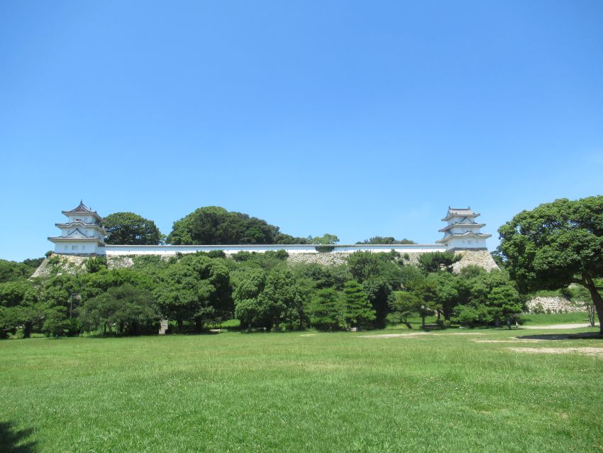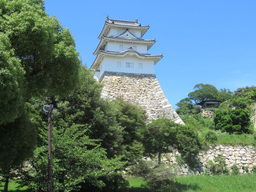 | 明石城は明石海峡近くの丘陵に築かれた連郭式平山城である。坤櫓と巽櫓が現存し、いずれも国の重要文化財となっている。巽櫓は船上山城からの移築とされ、坤櫓に至っては伏見城からの移築遺構と伝わる歴史的にも貴重な建築物である。明石城には天守台が残るが天守が建てられたことはなく、坤櫓が天守の代用とされたようだ。本丸にはこの2つの櫓以外にも往時には北東側に艮櫓、北西側に乾櫓が建っていた。本丸に三重櫓を四隅に備えた明石城は10万石の大名のお城としてはかなり規模の大きな城だったことがうかがえる。また重要文化財の2基の櫓以外にも、南側にそびえ立つ高石垣は必見である。 |