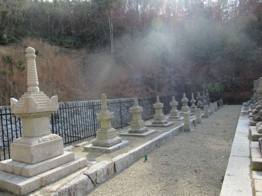 ![]() 20基の宝篋印塔(ほうきょういんとう) 歴代沼田小早川家当主の墓などが二列並び、前列一番右側が小早川隆景の墓 |