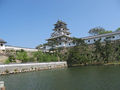 | 今治城は築城の名手・藤堂高虎が瀬戸内海に面した海岸線に築いた大規模な平城で、海水を引き入れた三重の堀や港(船入)などを備えた日本屈指の海城だった。他の城より格段に広い堀には海水を引き入れ、潮の干満によって海水の入れ替えが行われるようになっていた。 高虎は今治城を大規模な海城として築いた以外にも当時としては画期的な枡形の多用や層塔型天守の採用など行い、その後の城郭普請に大きな影響を与えた。 明治維新後に建造物のほとんどが取り壊されたため、内堀と本丸、二の丸、石垣などを残すのみとなったが、近年天守の他、櫓4基が復興されている。堀の外から天守を含め櫓、石垣を見ると海城らしいなかなか美しい姿を見せてくれるお城である。また今治城は、高松城と中津城とともに日本三大水城の1つにも数えられている。 |