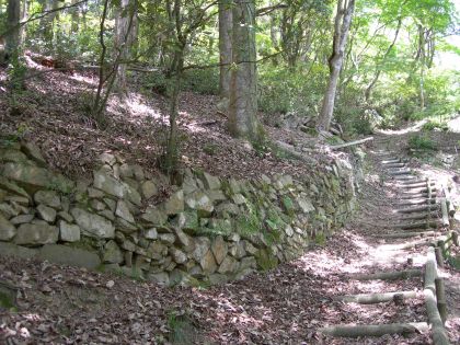 ![]() 「天神の丸」「大松山城」に向かう通路には、 石垣がところどころ残っている。 |