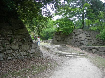 ![]() 大手道石段の奥側が 伝 前田利家邸跡 手前が秀吉邸跡。 |