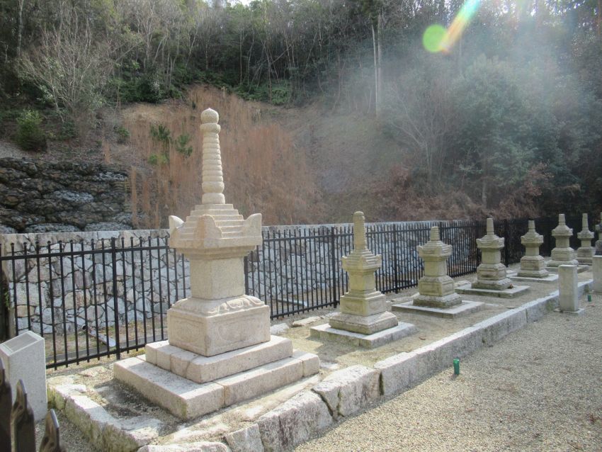 ![]() 20基の宝篋印塔(ほうきょういんとう) 歴代沼田小早川家当主の墓などが二列並び、前列一番右側が小早川隆景の墓 |